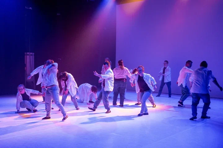 Na scenie Teatru Rozbark wystąpiły dwie grupy zajęciowe – młodsza i starsza – prowadzone przez Ewelinę Dehn oraz Beatę Grzelak-Szwedę. Całość zbudowano wokół ruchu, ale nie chodziło wyłącznie o układ kroków czy sceniczną dyscyplinę. Ruch stał się tu językiem emocji, sposobem na pokazanie relacji między ludźmi i na zapisanie tego, co trudno nazwać wprost.