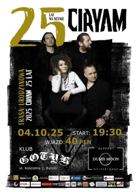 CIRYAM to formacja z południa Polski łącząca alternatywny rock, metal i elementy prog-rocka. Charakterystycznym atutem grupy jest wyrazisty głos wokalistki Moniki Węgrzyn. Na koncie mają pięć płyt studyjnych, a ostatnie wydawnictwo zatytułowane Zamyślony zapach spotkało się z dobrym odbiorem słuchaczy i recenzentów. Trasa, podczas której zespół wystąpi w Bytomiu, ma charakter urodzinowy i obejmuje prezentację materiału z różnych etapów działalności zespołu.